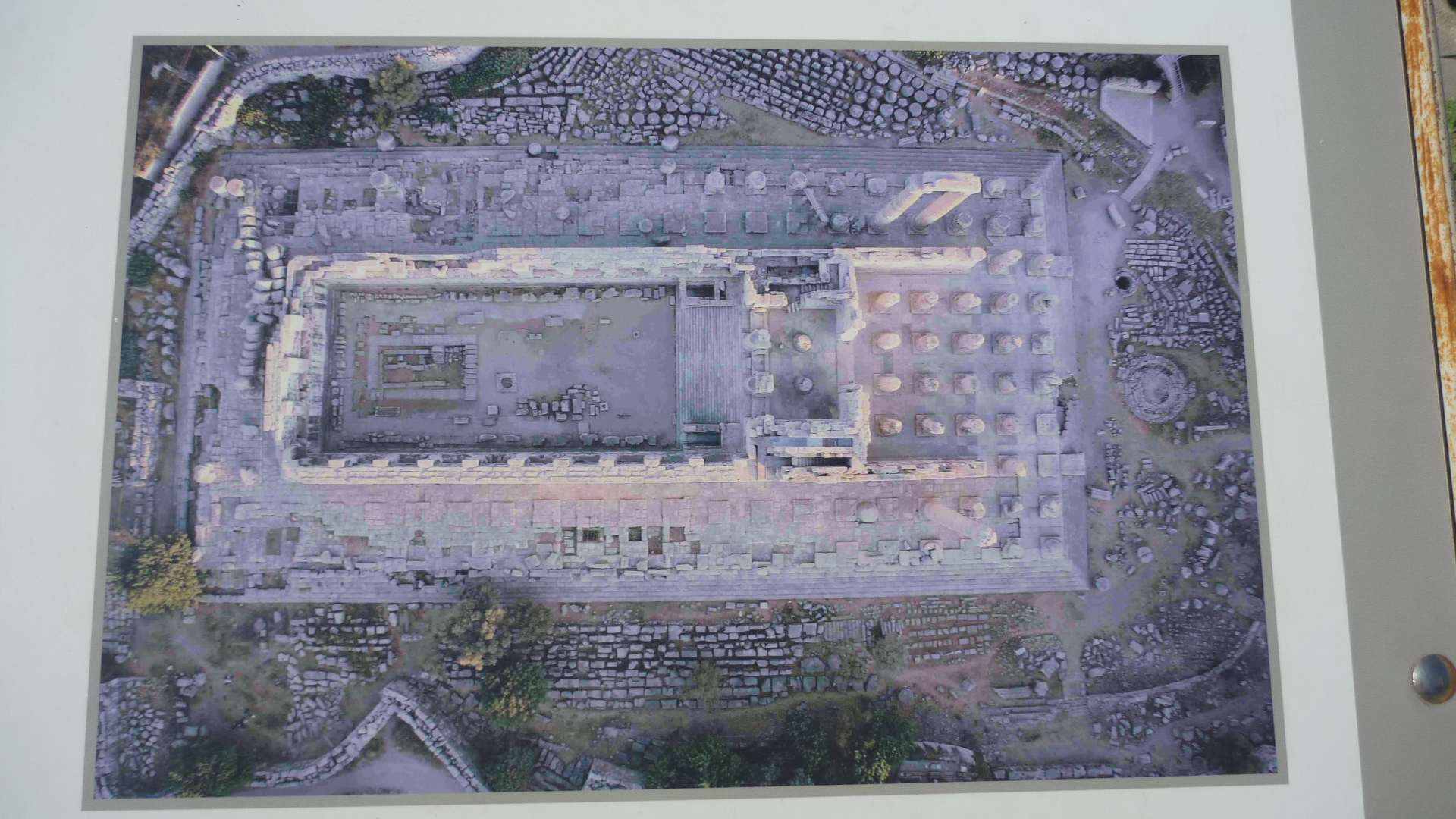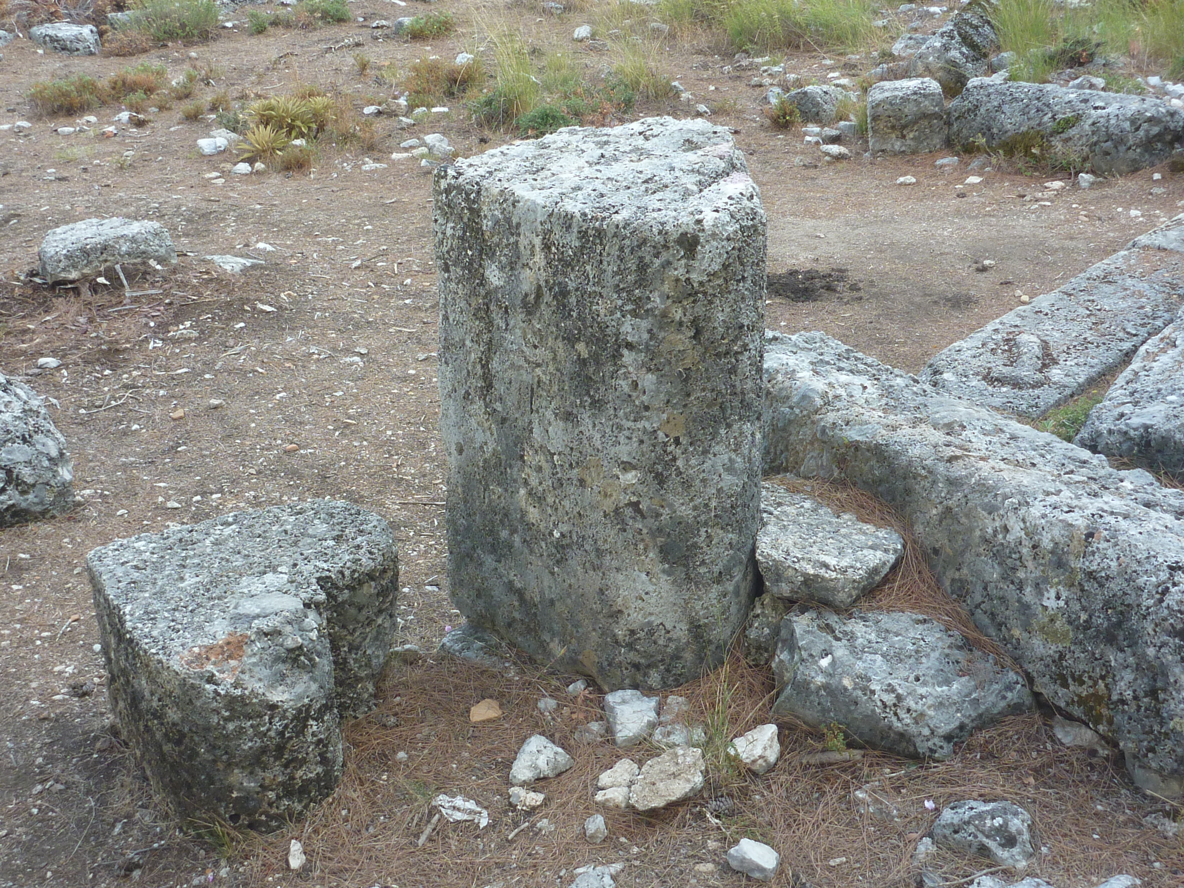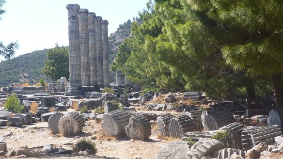 The temple of Apollo, ravaged by earthquake, is now a field of elements of the fluted columns.