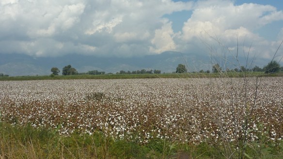 Heat and plentiful water explain the extensive cotton fields in the fertile valley – in full harvest mode in October.