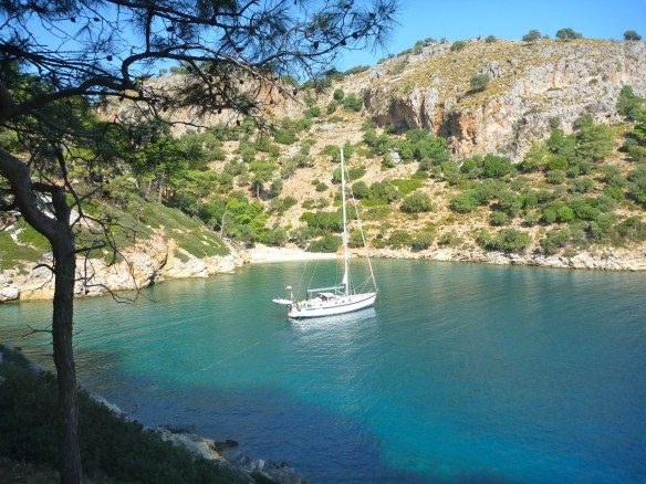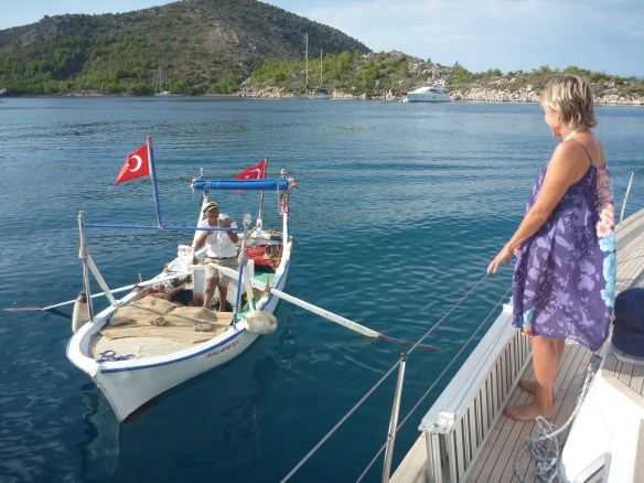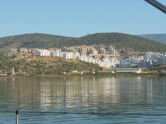 The Gulluk Gulf, between Didim and Bodrum was notable for its many fish farms. Although thankfully many of the farms have now been removed from smaller bays, the green, cloudy water in these bays is very different to the normal pristine Turkish waters. On the up side, the fish farms and the large number of white concrete box holiday homes mean that there are few boats here, so we could anchor in isolation.