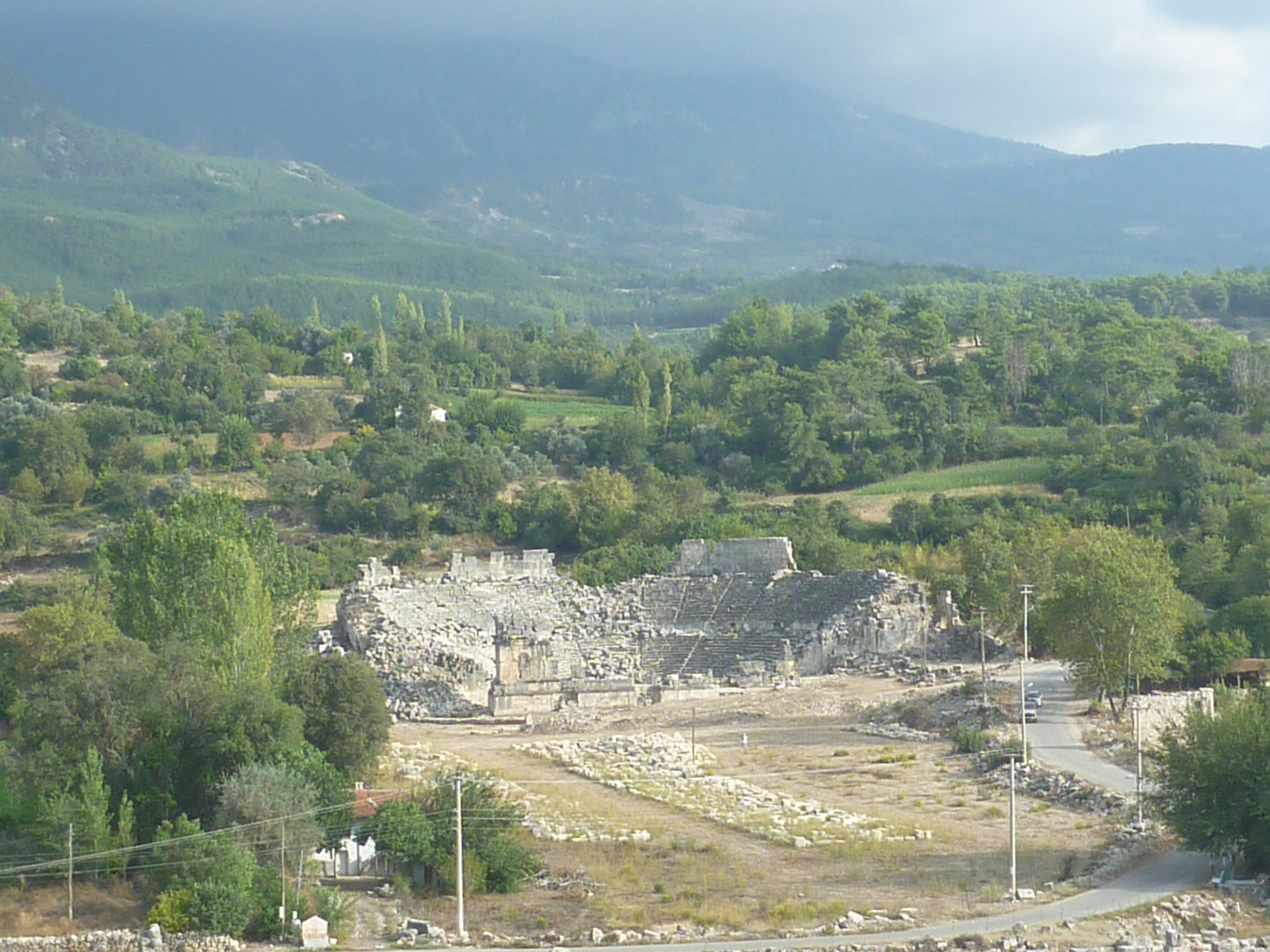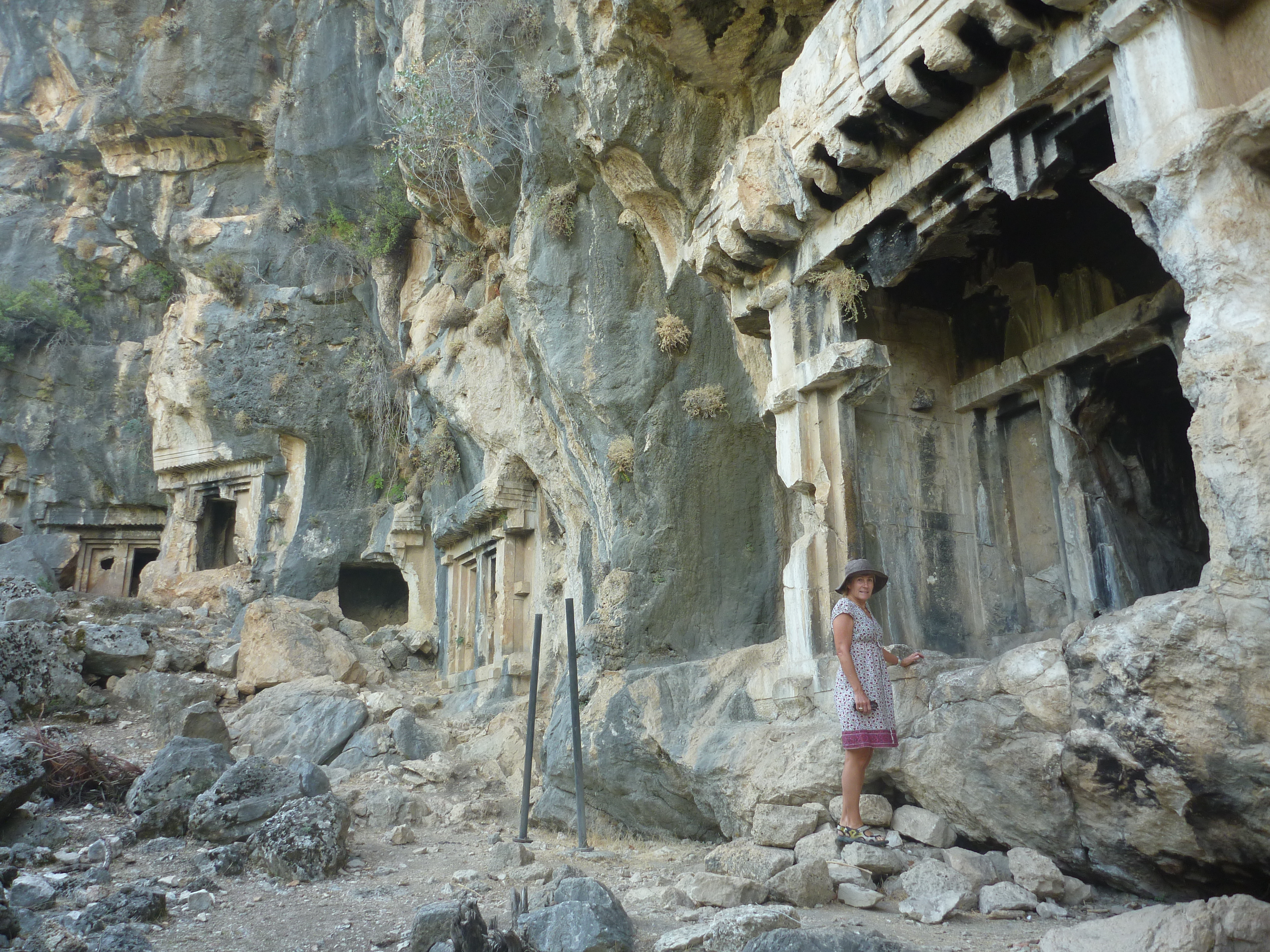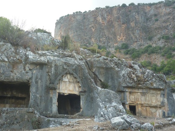 Also time for some sightseeing – the ancient sites of Pinara and Tlos, a short drive from Gocek. Pinara is accessed via a small road off the highway just north of Esen – not easy to find. The rather overgrown ruins are in a spectacular rugged setting. It is hard to imagine how the people managed to dig the large number of ‘pigeon’ rock tombs into the high, vertical rock face overlooking the site.